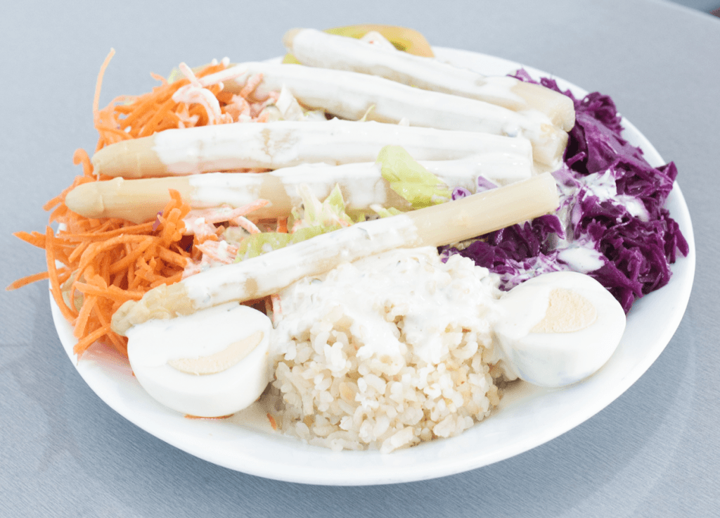 Una forma deliciosa y saludable de disfrutar del Plato Especial kebap: Lombarda, espárragos, lechuga, tomate, zanahoria, huevo duro y salsa blanca.